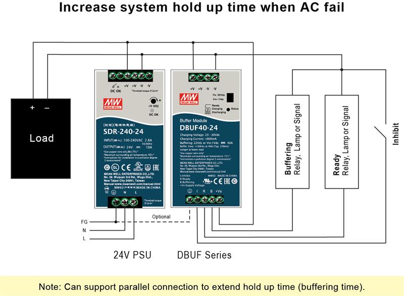 DBUF20/40與已上市DR-UPS40不斷電備援功能類似,主要特點: 透過內部電解電容儲能來提供短暫緩沖時間,不需額外接電池,免定期更換電池可降低系統維護成本。而DC-UPS40則是需外接電池,備援時間可較長但需定期更換電池。DBUF20/40系列推出后,明緯DIN rail外圍模塊已相當齊全,可提供10~960W 軌道式電源供應器及外圍配件模塊,提供一站式購足服務!