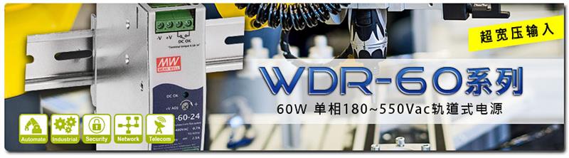 在自動化設備的需求強勁下,帶動了軌道式(DIN Rail)電源迅速成長。繼WDR-120(120W)、WDR-240(240W)、WDR-480(480W)等系列銷售長虹后,明緯看好更小60W泛用瓦數需求,新推出了60W單相180~550Vac超寬壓輸入之薄型軌道式電源供應器:WDR-60系列。獨步全球,WDR-60強力上市后,明緯WDR家族涵蓋60~480W,是目前市面上180~550Vac寬壓輸入軌道式電源瓦數最完整的產品線。